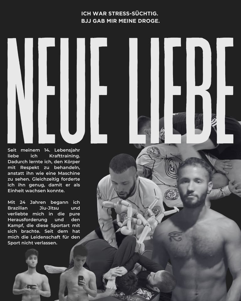 Ich begann mit 24 Jahren auf dem Buckel Brazilian Jiu-Jitsu und verliebte mich in die pure Herausforderung und den Kampf, die diese Sportart mit sich brachte.