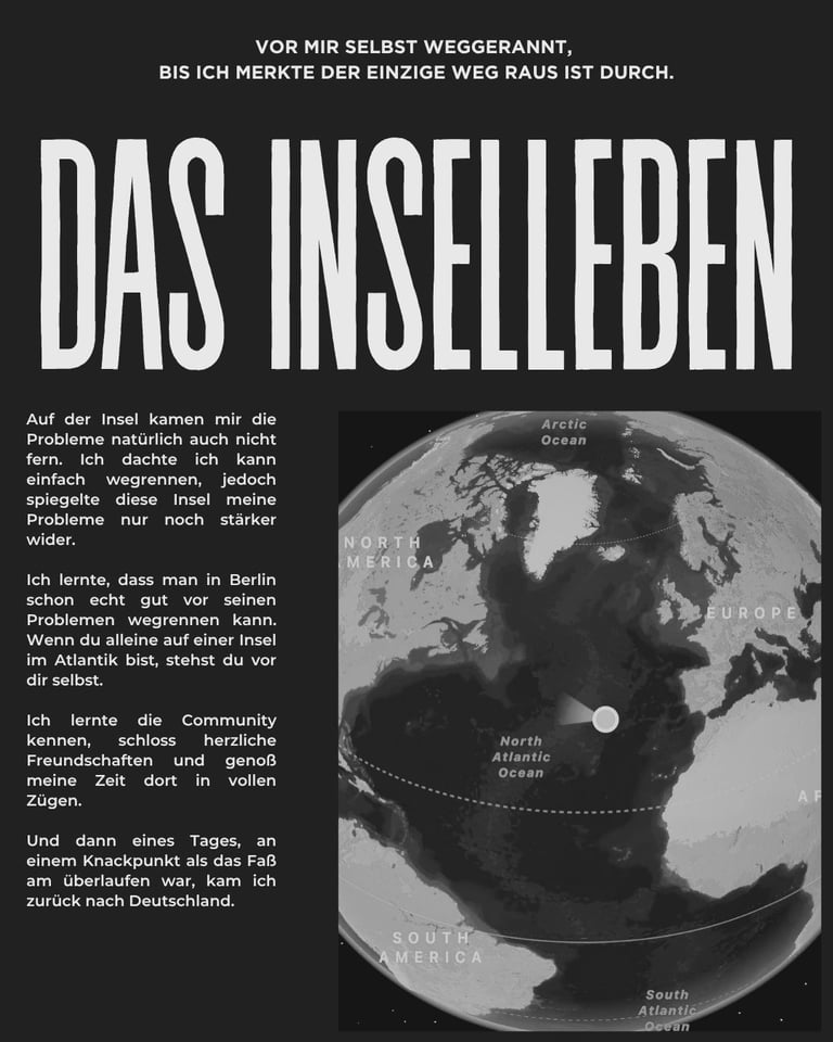Nach dem Abschluss fing ich sofort als Freelancer an. Ohne finanzielle Rücklagen oder Wissen zog ich auf eine portugiesische Insel mitten im Atlantik. Ich war Deutschland etwas sauer und wollte immer wieder den Boden unter den Füßen verlieren, auf der Suche nach irgendeinem Sinn.